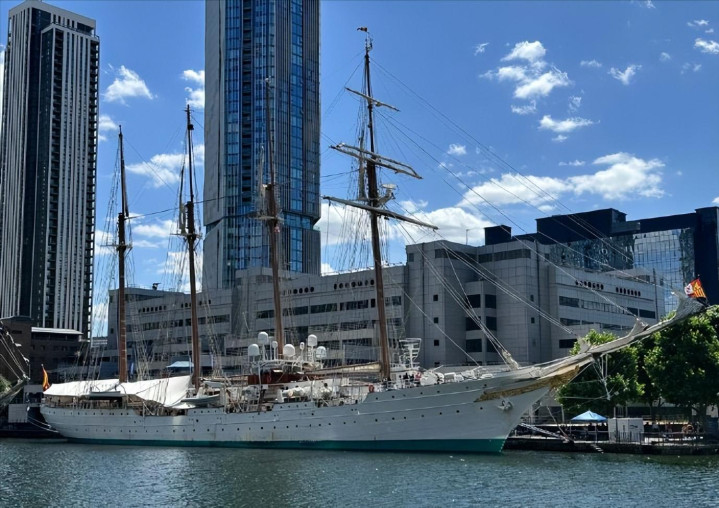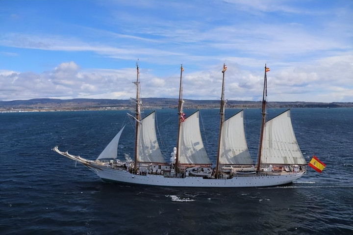 两难之下,西班牙想出了绝妙办法:派出了一艘1927年下水的四桅帆船“胡安·塞巴斯蒂安·德·埃尔卡诺”号。这艘全长113米的训练舰,没有导弹、没有火炮、没有机库、没有雷达,纯靠风帆加辅助柴油机驱动。